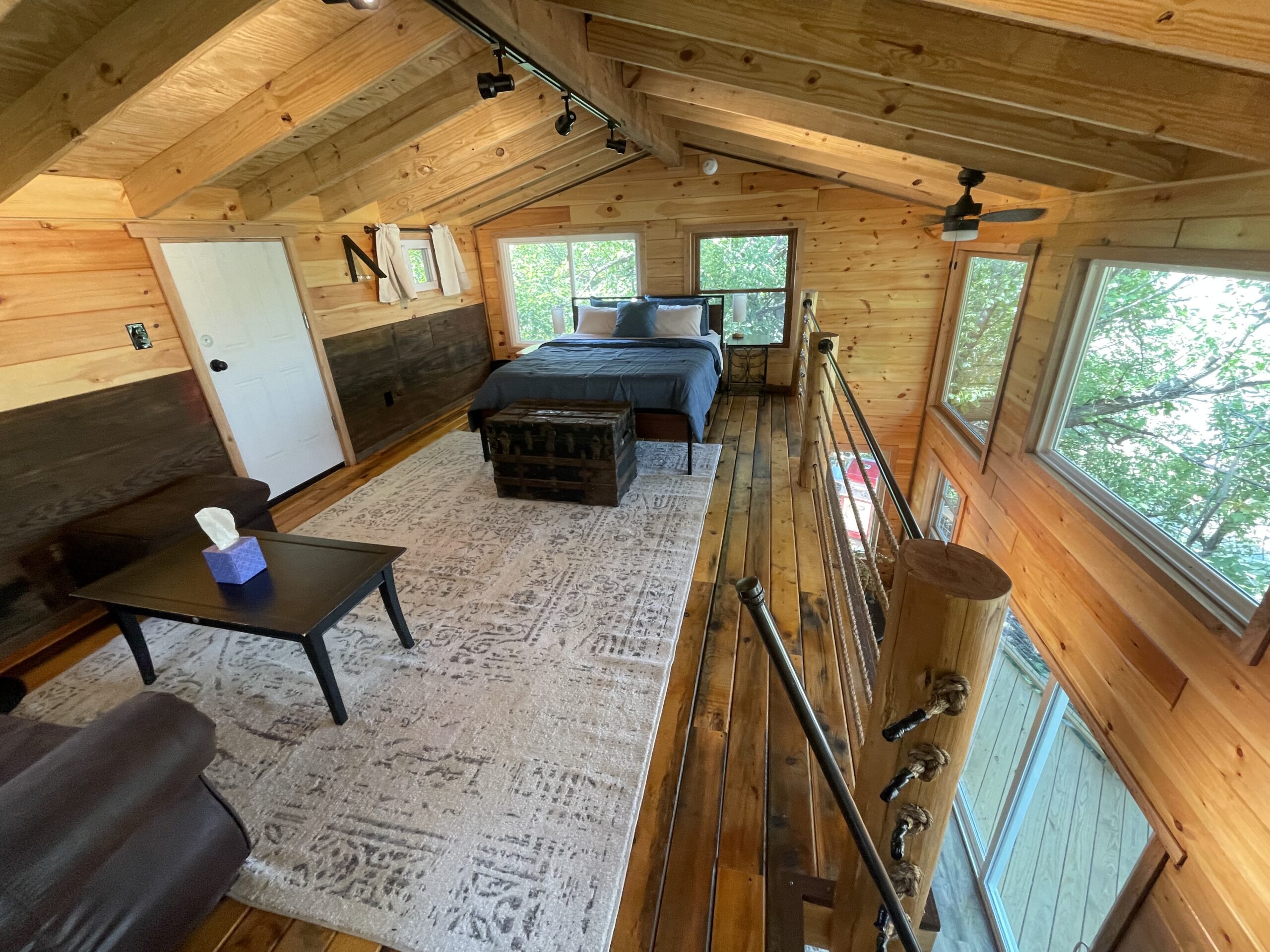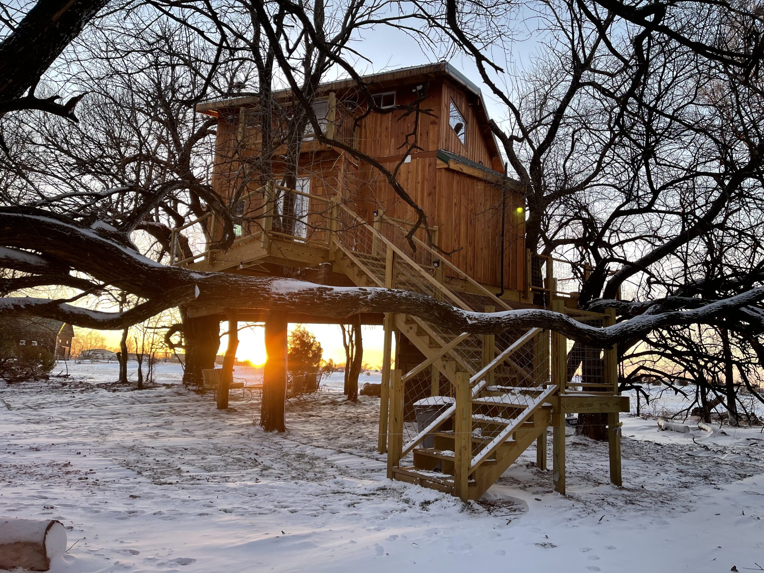The Treehouse, it is truly a one-of-a-kind experience. Designed by treehouse masters, the 600 Sq ft treehouse sleeps 4 and features all the amenities of home, including a kitchen, full bathroom, and large deck. The views of the sunset from the treehouse are simply magical, and staying in the trees is an unforgettable experience.